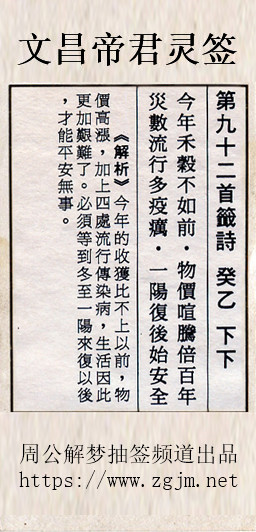 文昌帝君灵签第九十二签:癸乙下下
