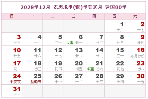 2028年12月 农历戊申(猴)年癸亥月 建国80年