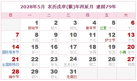 2028年5月 农历戊申(猴)年丙辰月 建国79年
