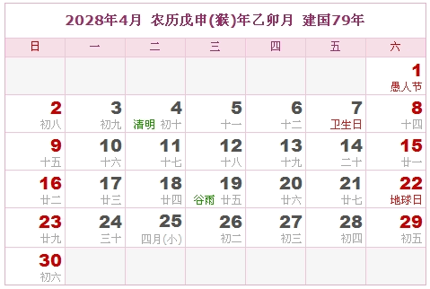 2028年4月 农历戊申(猴)年乙卯月 建国79年
