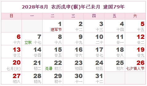 2028年8月 农历戊申(猴)年己未月 建国79年