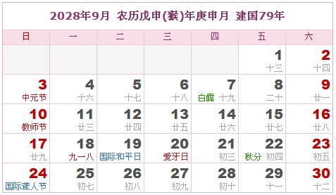 2028年9月 农历戊申(猴)年庚申月 建国79年