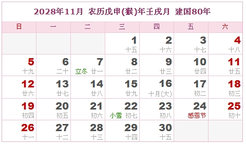 2028年11月 农历戊申(猴)年壬戌月 建国80年