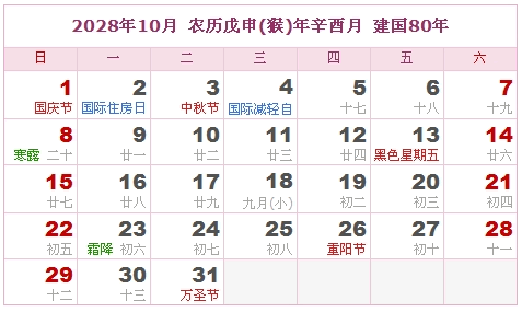 2028年10月 农历戊申(猴)年辛酉月 建国80年