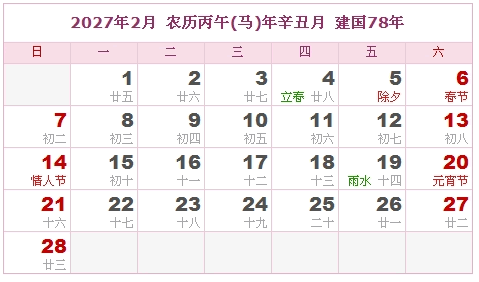 2027年2月 农历丙午(马)年辛丑月 建国78年