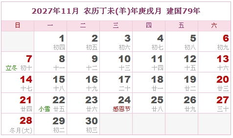 2027年11月 农历丁未(羊)年庚戌月 建国79年