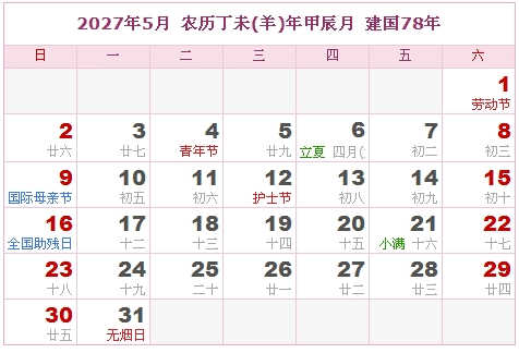 2027年5月 农历丁未(羊)年甲辰月 建国78年