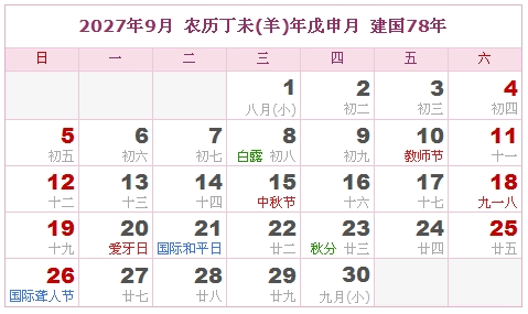 2027年9月 农历丁未(羊)年戊申月 建国78年