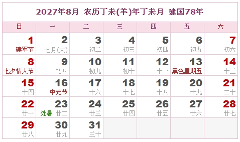 2027年8月 农历丁未(羊)年丁未月 建国78年