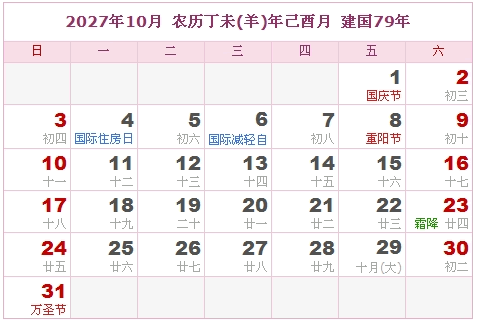 2027年10月 农历丁未(羊)年己酉月 建国79年