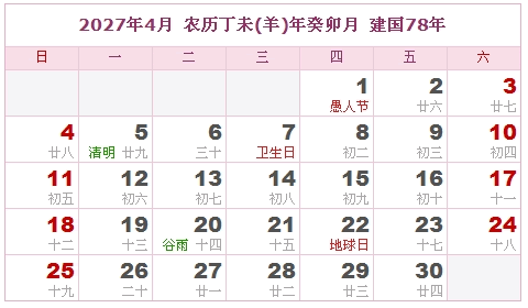 2027年4月 农历丁未(羊)年癸卯月 建国78年