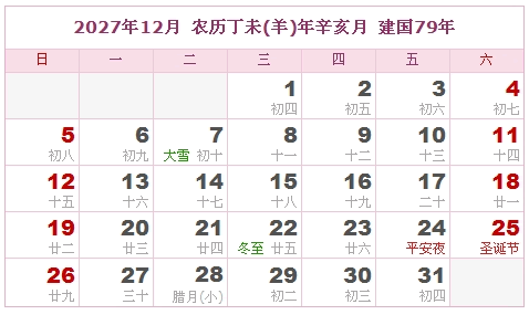 2027年12月 农历丁未(羊)年辛亥月 建国79年