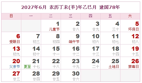 2027年6月 农历丁未(羊)年乙巳月 建国78年