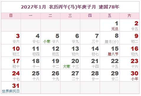 2027年1月 农历丙午(马)年庚子月 建国78年