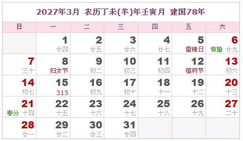 2027年3月 农历丁未(羊)年壬寅月 建国78年