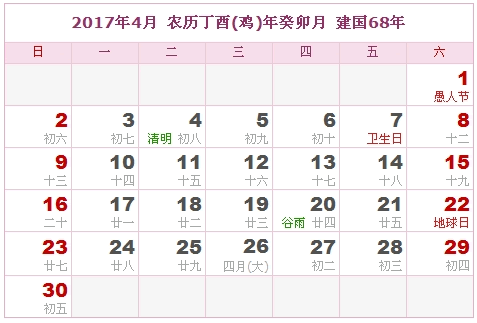 2017年4月 农历丁酉(鸡)年癸卯月 建国68年