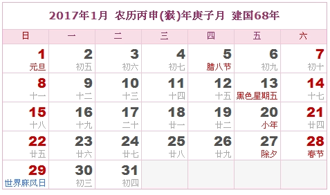 2017年1月 农历丙申(猴)年庚子月 建国68年