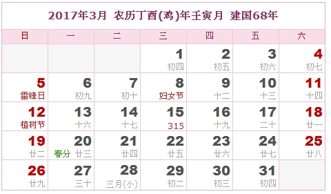 2017年3月 农历丁酉(鸡)年壬寅月 建国68年
