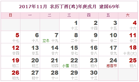 2017年11月 农历丁酉(鸡)年庚戌月 建国69年