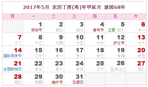 2017年5月 农历丁酉(鸡)年甲辰月 建国68年