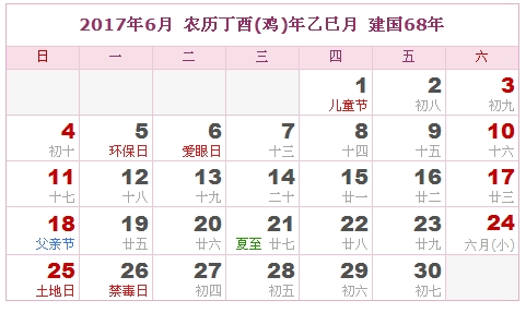 2017年6月 农历丁酉(鸡)年乙巳月 建国68年