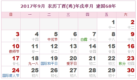 2017年9月 农历丁酉(鸡)年戊申月 建国68年