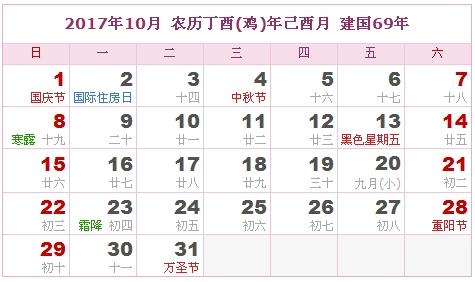 2017年10月 农历丁酉(鸡)年己酉月 建国69年