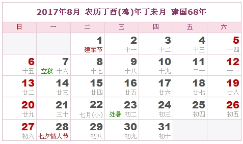 2017年8月 农历丁酉(鸡)年丁未月 建国68年