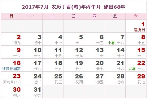 2017年7月 农历丁酉(鸡)年丙午月 建国68年