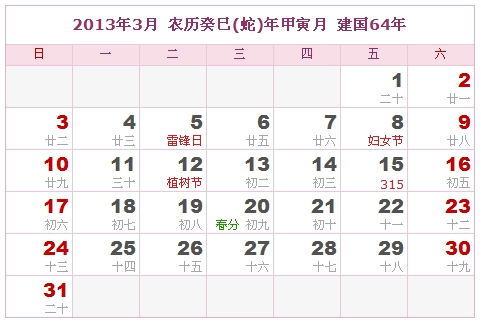 2013年3月 农历癸巳(蛇)年甲寅月 建国64年