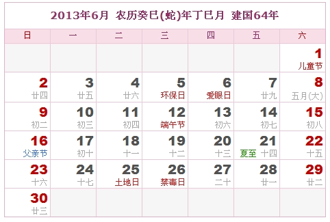 2013年6月 农历癸巳(蛇)年丁巳月 建国64年