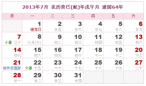 2013年7月 农历癸巳(蛇)年戊午月 建国64年