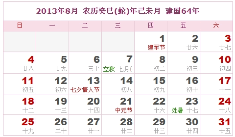 2013年8月 农历癸巳(蛇)年己未月 建国64年