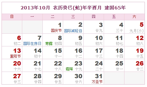 2013年10月 农历癸巳(蛇)年辛酉月 建国65年
