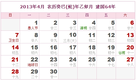 2013年4月 农历癸巳(蛇)年乙卯月 建国64年