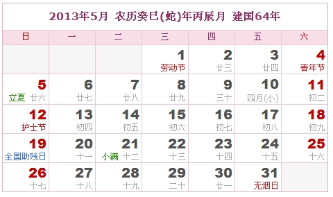 2013年5月 农历癸巳(蛇)年丙辰月 建国64年