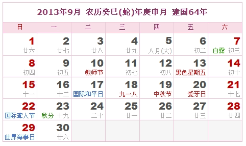 2013年9月 农历癸巳(蛇)年庚申月 建国64年