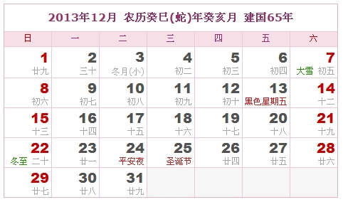 2013年12月 农历癸巳(蛇)年癸亥月 建国65年