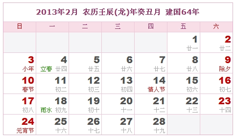 2013年2月 农历壬辰(龙)年癸丑月 建国64年