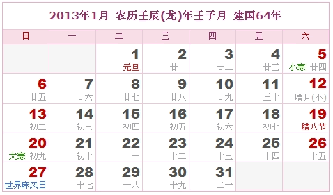 2013年1月 农历壬辰(龙)年壬子月 建国64年