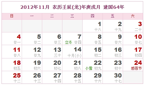 2012年11月 农历壬辰(龙)年庚戌月 建国64年