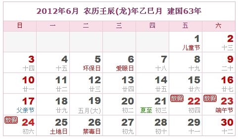 2012年6月 农历壬辰(龙)年乙巳月 建国63年