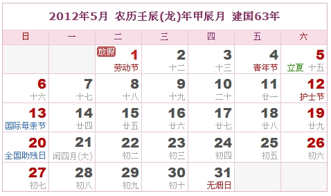 2012年5月 农历壬辰(龙)年甲辰月 建国63年