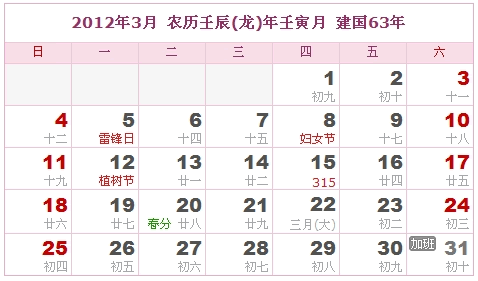 2012年3月 农历壬辰(龙)年壬寅月 建国63年