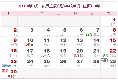 2012年9月 农历壬辰(龙)年戊申月 建国63年