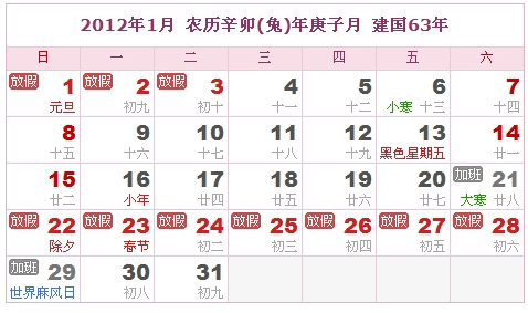 2012年1月 农历辛卯(兔)年庚子月 建国63年