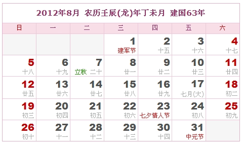 2012年8月 农历壬辰(龙)年丁未月 建国63年