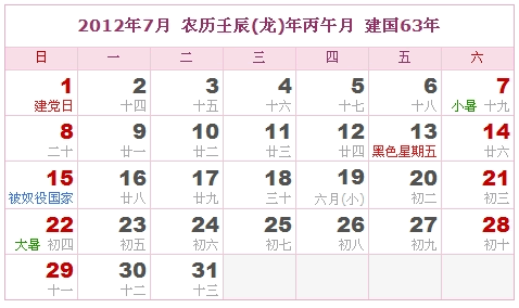 2012年7月 农历壬辰(龙)年丙午月 建国63年