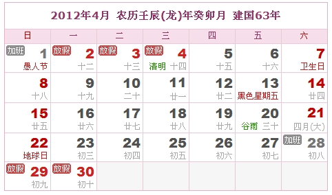 2012年4月 农历壬辰(龙)年癸卯月 建国63年
