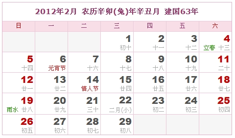 2012年2月 农历辛卯(兔)年辛丑月 建国63年